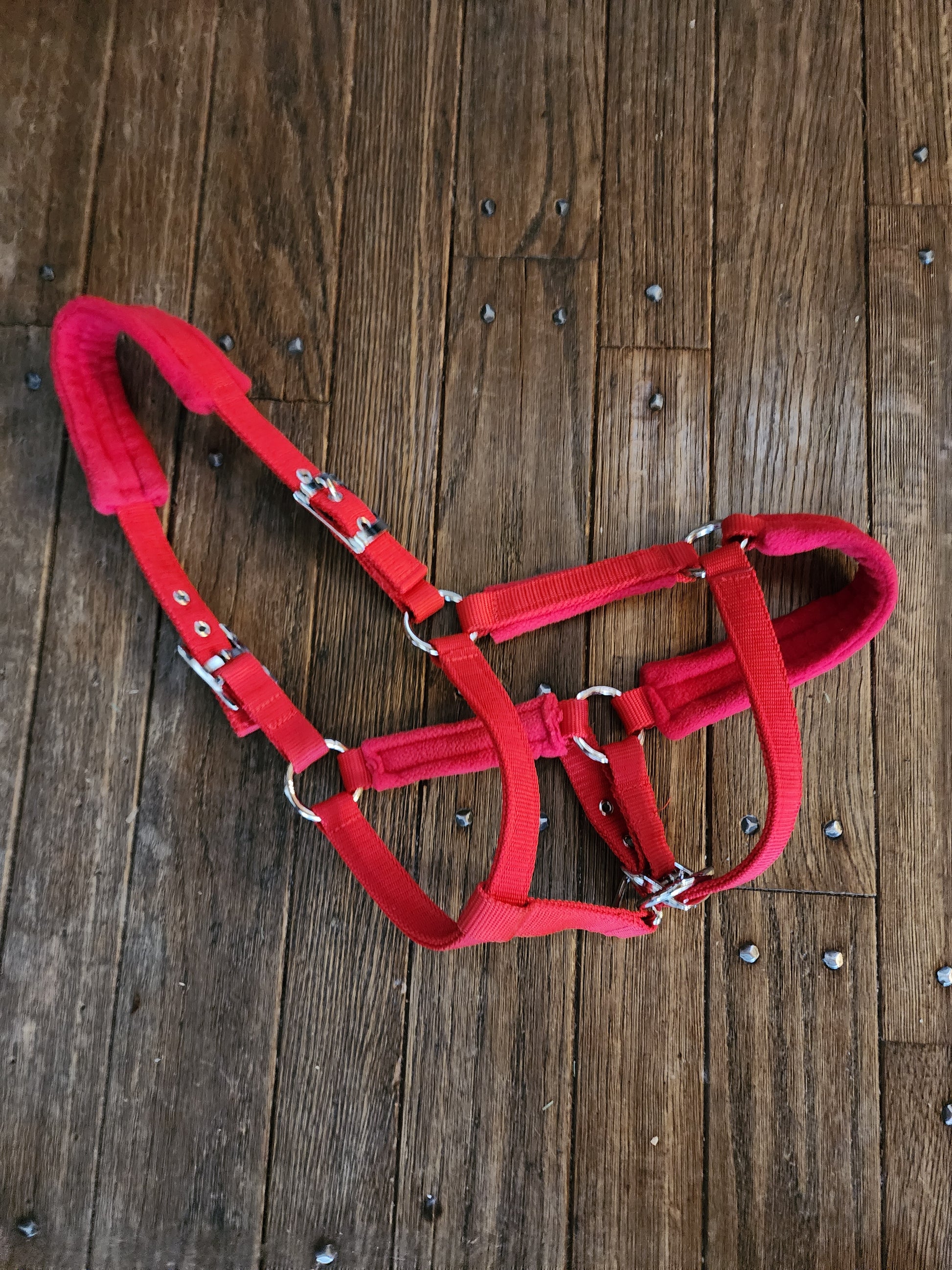 Gently used but clean red nylon halter with fleece on pressure points. Standard size.
